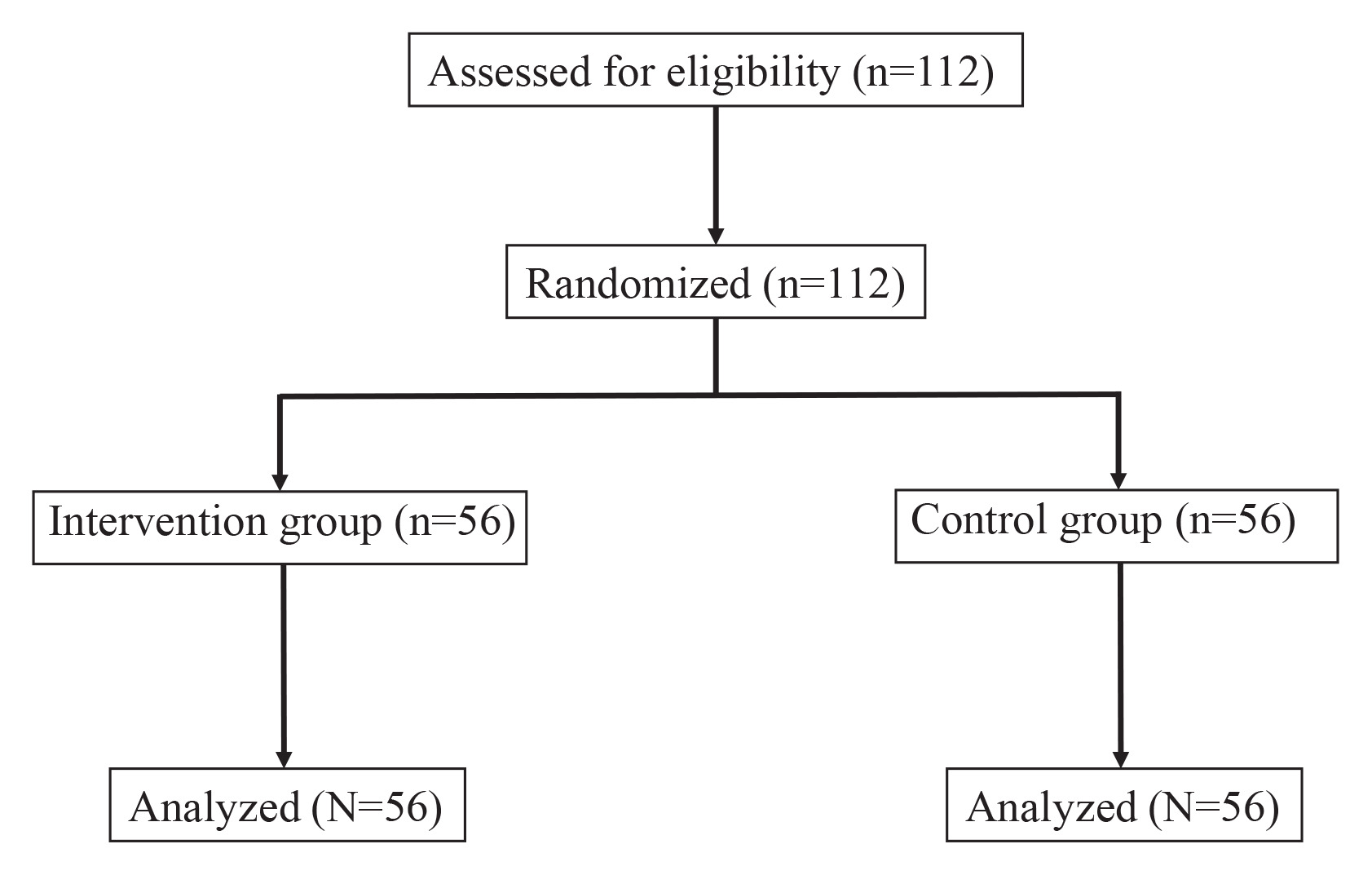 Of the 113 participants who provided informed consent to participate in the study, one was excluded due to missing data, resulting in a final sample of 112 participants: 56 in the intervention group and 56 in the control group (Figure 1 and Table 1).