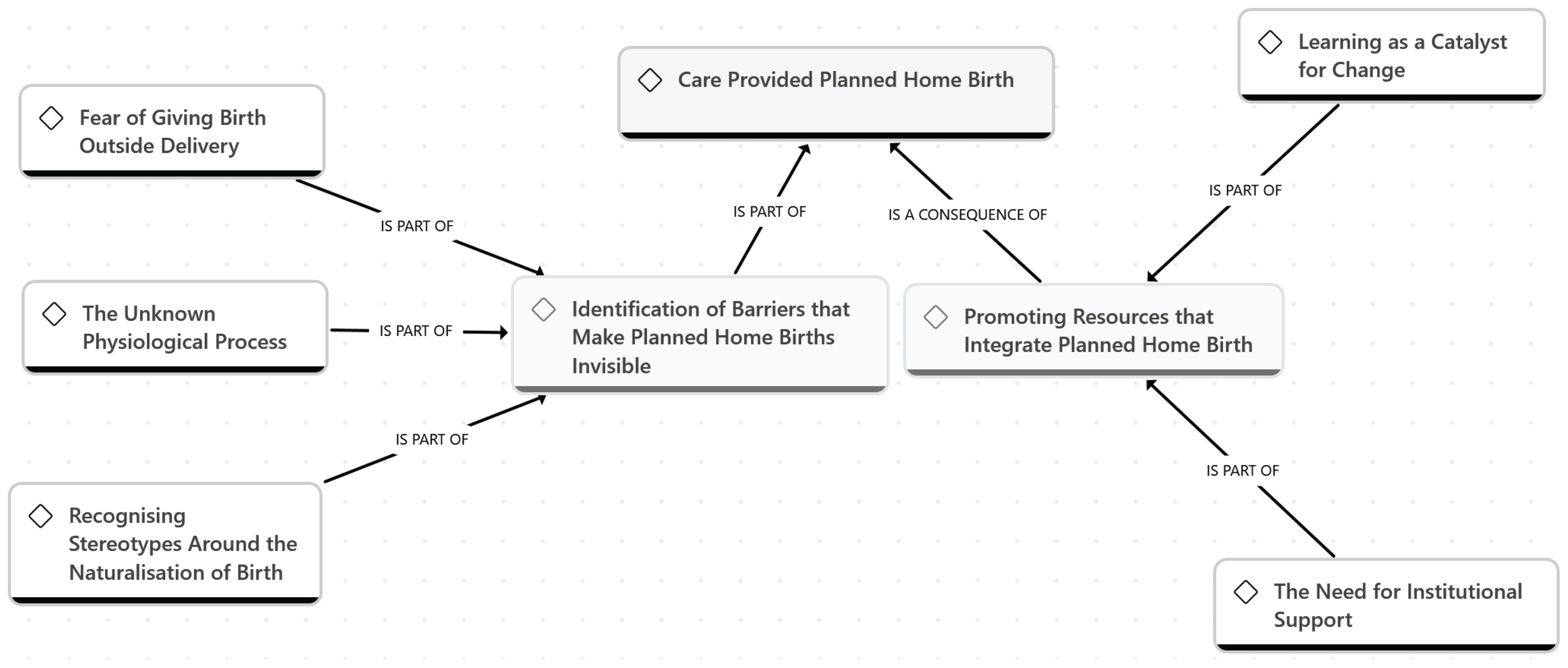 The interviews recordings were transcribed verbatim. Subsequently, alphanumeric codes were assigned to each participant (P1, P2, etc.) to ensure confidentiality and anonymity. ATLAS.ti version 25.0.1 (ATLAS.ti Scientific Software Development) was used as a resource for data analysis. A reflexive thematic analysis was conducted following the phases described by Braun and Clarke27: 1) The data analysis and familiarization phase began during the transcription and initial reading of the texts, noting preliminary ideas; 2) Systematic data coding involved rereading the transcripts and generating initial codes across the dataset, which were then grouped by meaning and patterns; 3) Theme generation consisted of identifying preliminary themes and developing a thematic map to establish relationships among them; 4) Review and refinement of themes ensured consistency between codes and emerging themes; 5) Refinement of the analysis included finalizing theme names, definitions and the coding structure. The first and last authors preliminary themes were discussed; and 6) The writing of the report included the analysis of previously selected extracts and the link of the analysis to the research question for the final interpretation. A conceptual map was developed to illustrate the main themes reflecting the experiences and perceptions of midwifery students about planned home births (Figure 2).