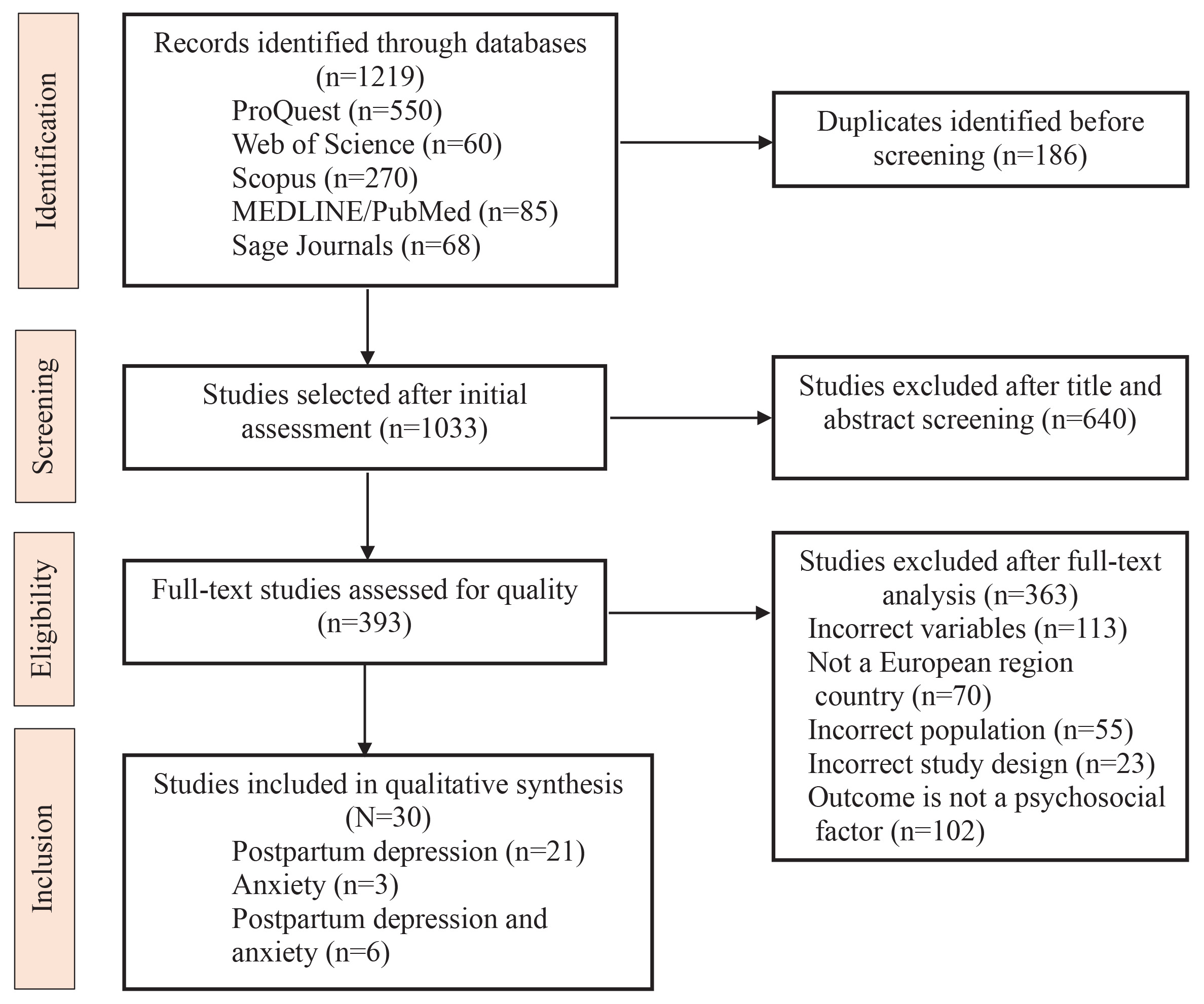 The initial search yielded a total of 1219 titles. After identifying and eliminating 186 duplicate records, two reviewers screened the remaining 1033 abstracts. This process resulted in 393 articles being selected for full-text assessment. The primary exclusion criteria in this phase included irrelevance to the central concepts of the research, studies not originating from European countries, and inappropriate sample selection. Additionally, during the full-text screening phase, studies were excluded for the following reasons: outcomes not addressing psychosocial risk factors (n=102), inclusion of incorrect variables (n=113), studies conducted outside the European region (n=70), inappropriate study population (n=55), and unsuitable study design (n=23). Additional reasons for exclusion were insufficient methodological information, protocol-only publications, or lack of full-text availability. Thirty studies22-51 were deemed eligible and included in the scoping review, of which 21 focused solely on PPD, three on PPA, and six on both on PPD and PPA. Overall, the scoping review includes studies from 16 countries in the European region (Albania, Belgium, Cyprus, Denmark, Finland, France, Germany, Italy, Netherlands, Poland, Portugal, Serbia, Slovakia, Sweden, Switzerland, and the United Kingdom) published between 2019 and 2024 (Supplementary file Appendix 5).