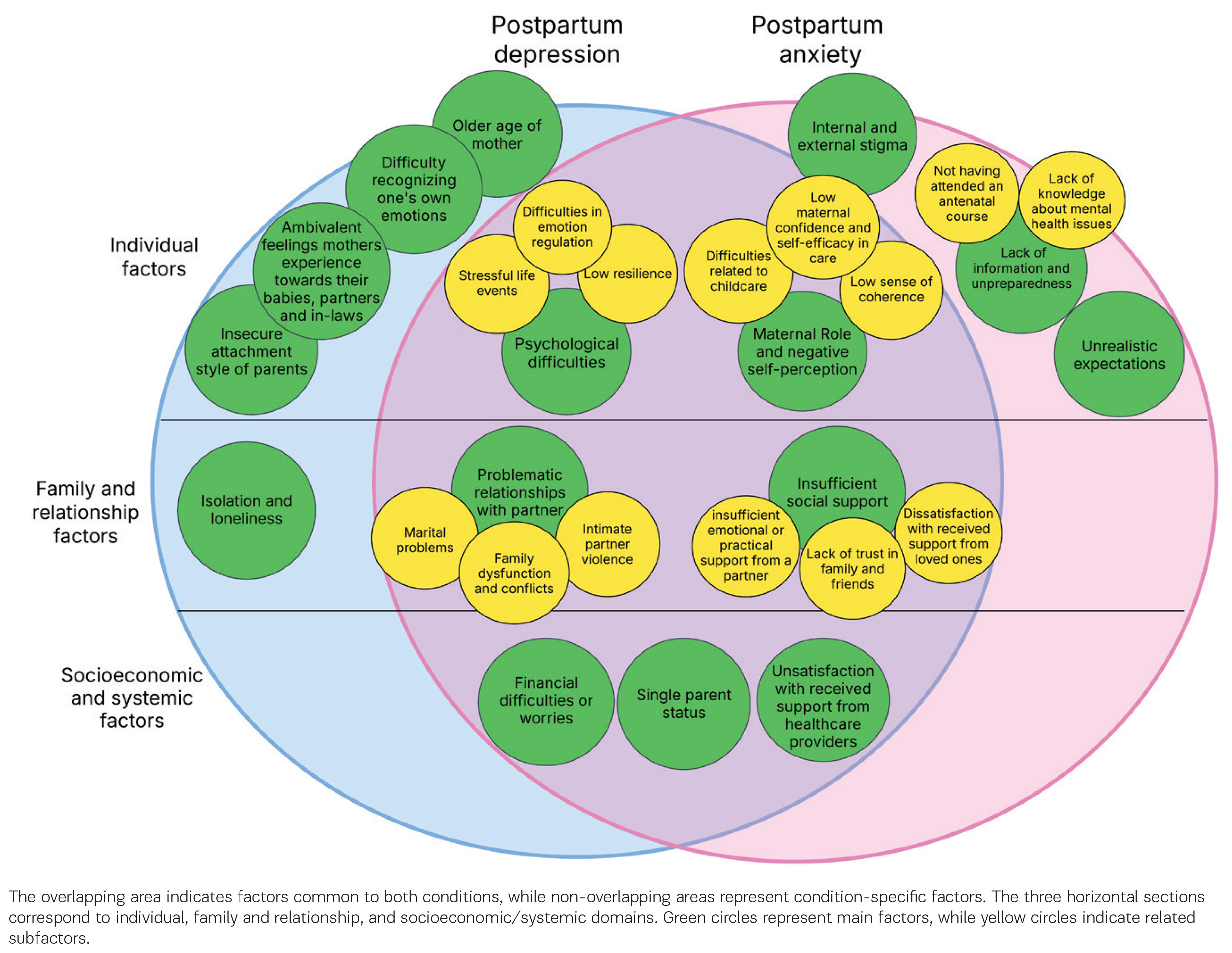 Individual-level risks associated with PPD and PPA include stressful life events, emotional regulation difficulties, low resilience, and maternal self-doubt. Relational risks, particularly insufficient partner support, conflict, or violence, emerged as especially salient. Additionally, financial strain, single parenthood, and dissatisfaction with healthcare support further contributed to maternal distress.