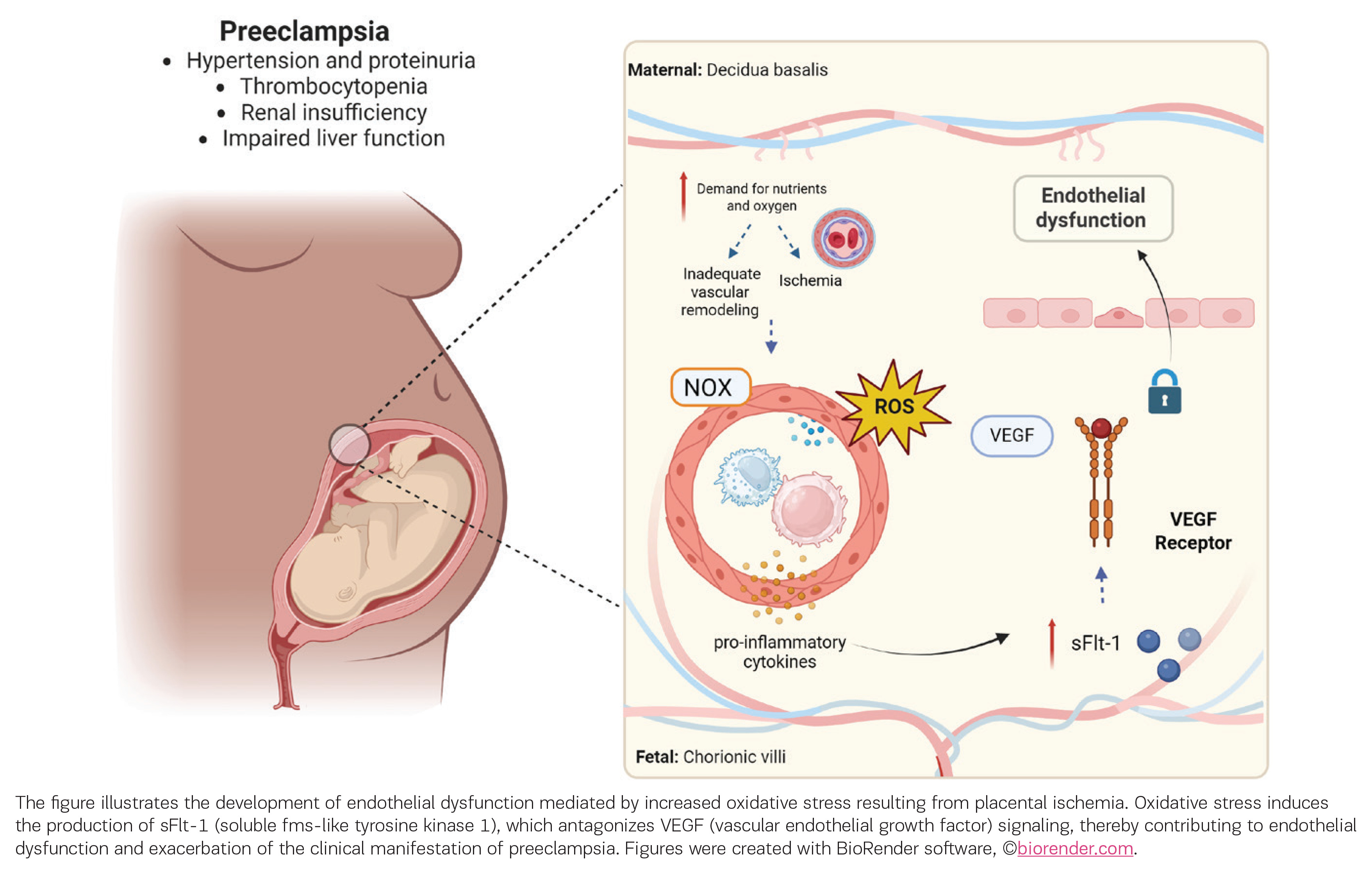 Clinical studies have consistently reported increased circulating levels of inflammatory mediators, including tumor necrosis factor-α (TNFα) and interleukin (IL)-6, along with reduced concentrations of anti-inflammatory cytokines such as IL-10 and IL-4 in women with PE3,14. Notably, increased OS has been detected as early as 16–20 weeks of gestation in women who later develop PE, suggesting that excessive ROS production disrupts placental development and may contribute to disease programming27,29. More recent evidence further supports these findings, demonstrating elevated ROS and lipid peroxidation products, reduced antioxidant enzyme activity, and increased antiangiogenic factors in maternal blood and placental tissue from women with PE30.